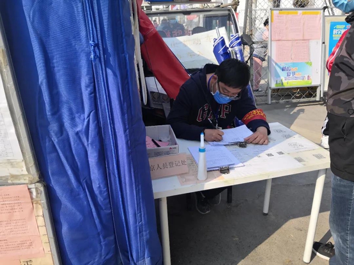 还有一件事我很骄傲。在工作中,我发现工作人员检查证件时全都集中在卡口前,再加上村口人员嘈杂,使检查工作既降低了效率,又容易造成人员聚集,于是我提议,检查证件和测量体温这两项工作分别由两位同事进行,在卡口处检查证件,进入帐篷后由另一位同事对村民们进行体温测量,这样做提高了人员通过效率,也避免了村口人员聚集。